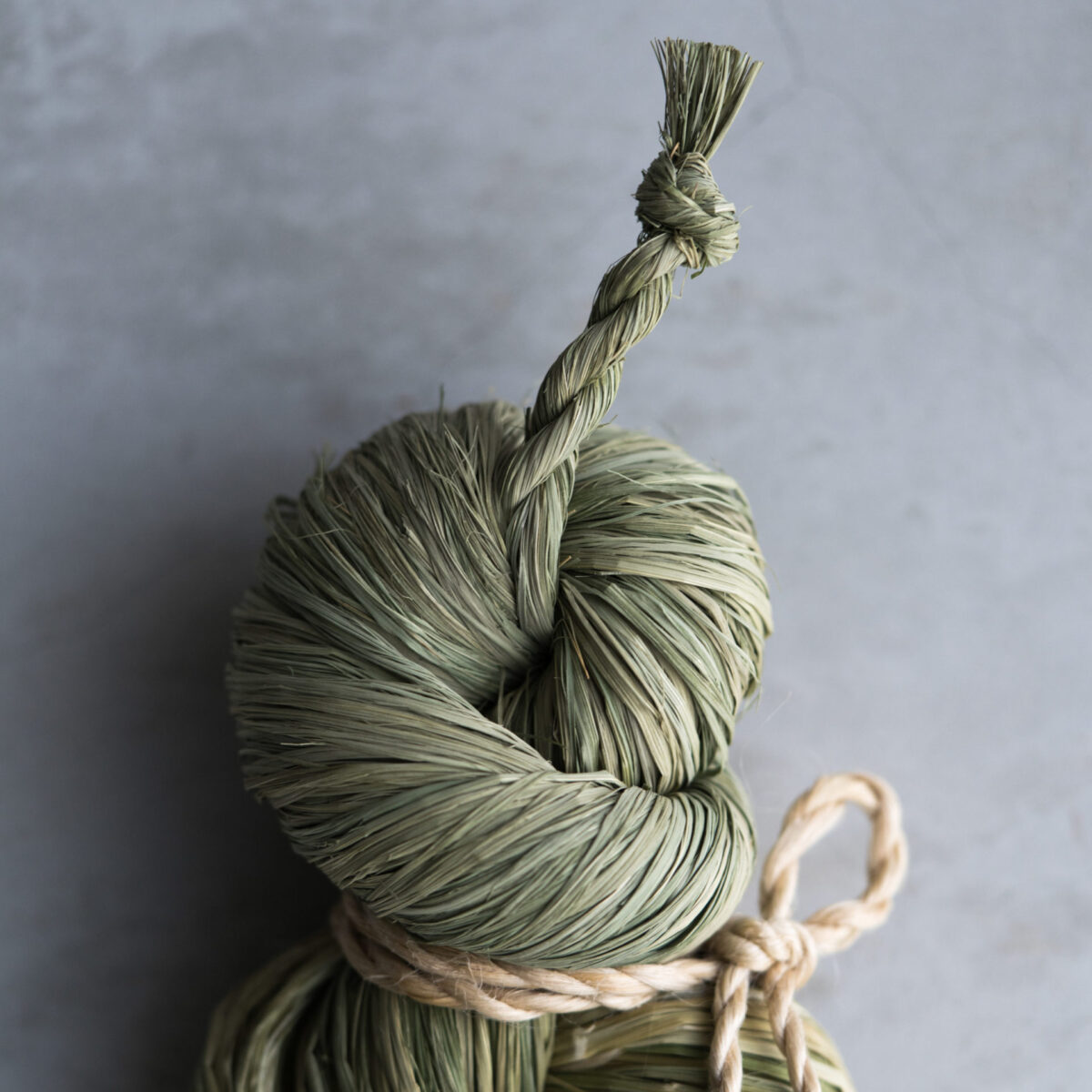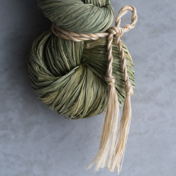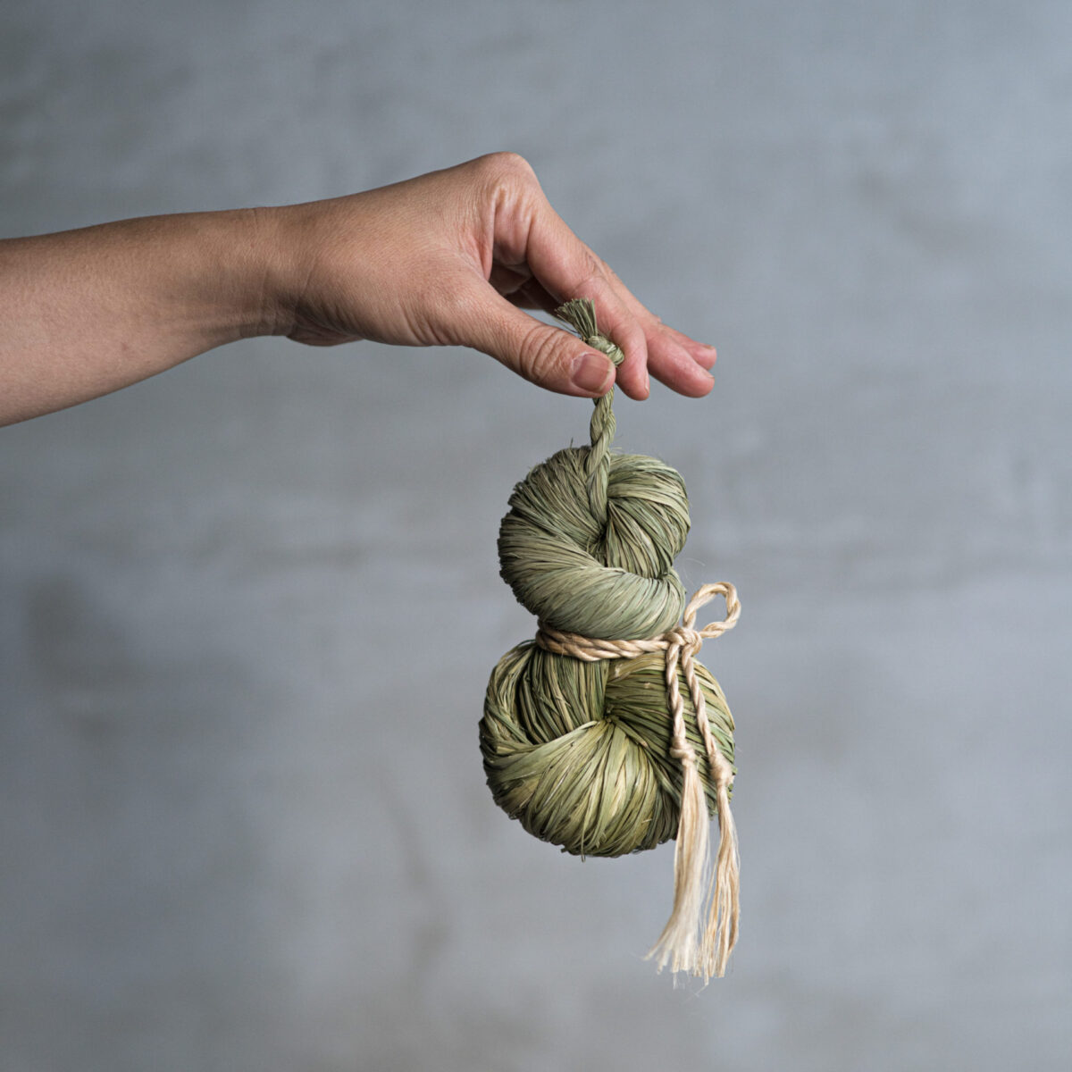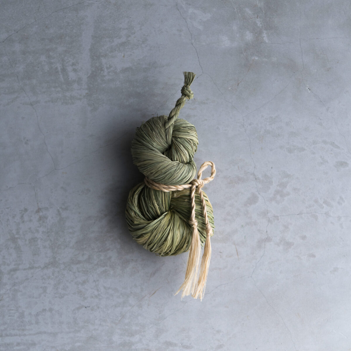 瓢箪は、種子が多いことから子孫の繁栄や多福をよぶことをあらわす吉祥文様。 3つ揃って三拍(瓢)子で縁起良し、6つ揃って無病(六瓢)息災のお守りになるとも言われています。中央に結んだのは大麻で作った縄。大麻は古より信仰の場においては清めという重要な役割を担ってきた素材です。米が実る前の今年の夏に刈り取った青わら(実とらず)で作っており、いい香りがします。