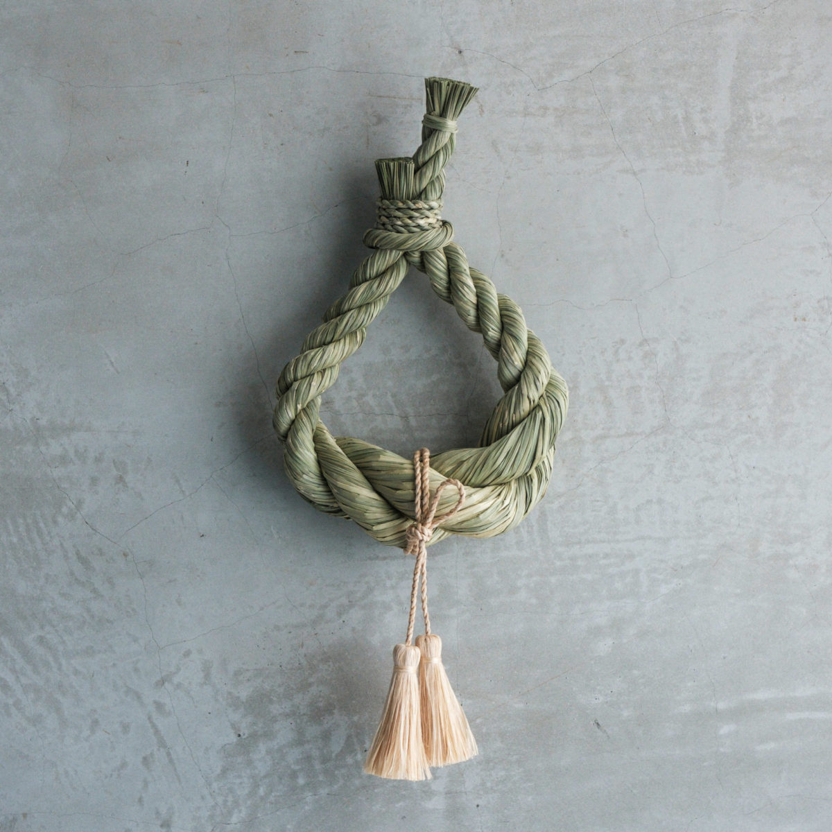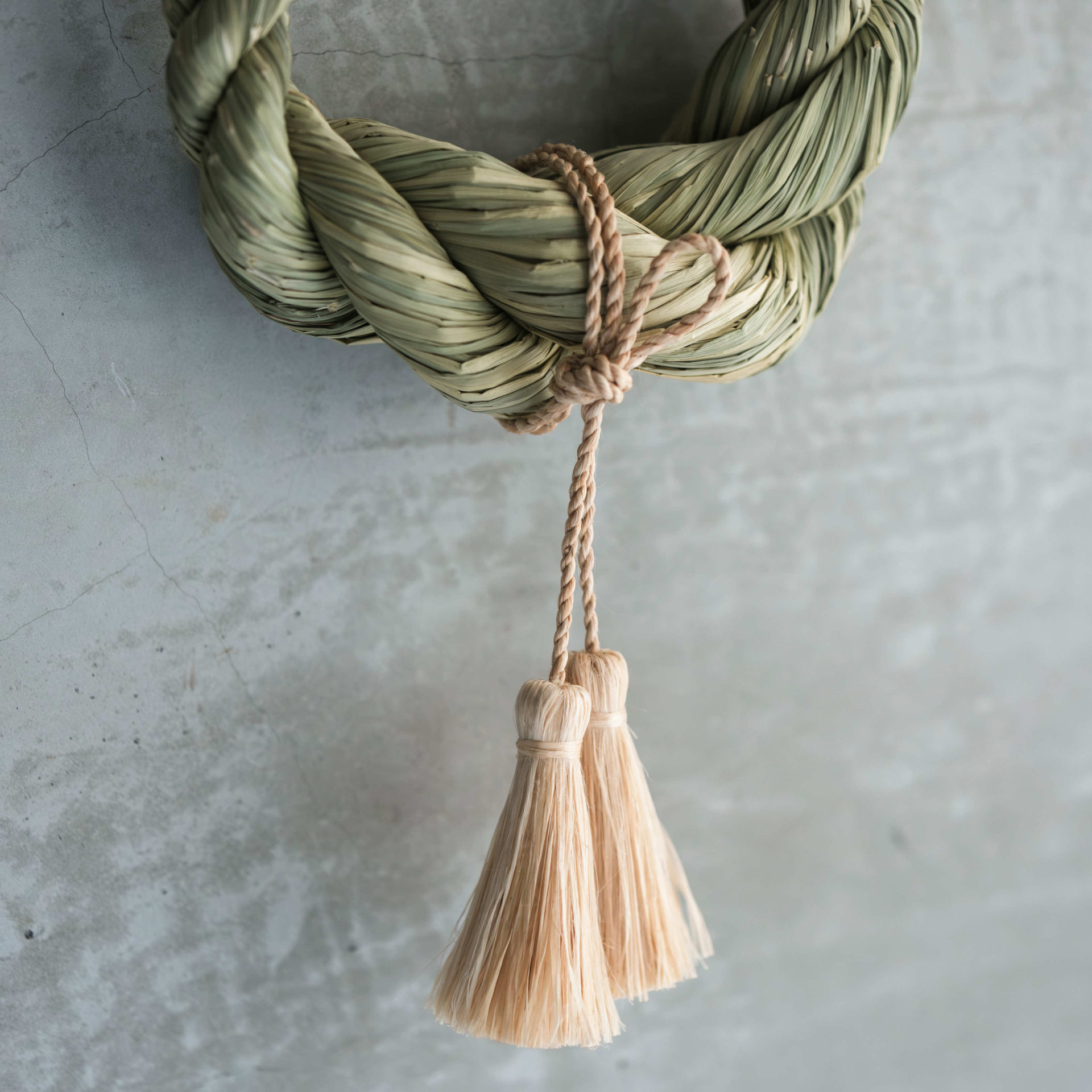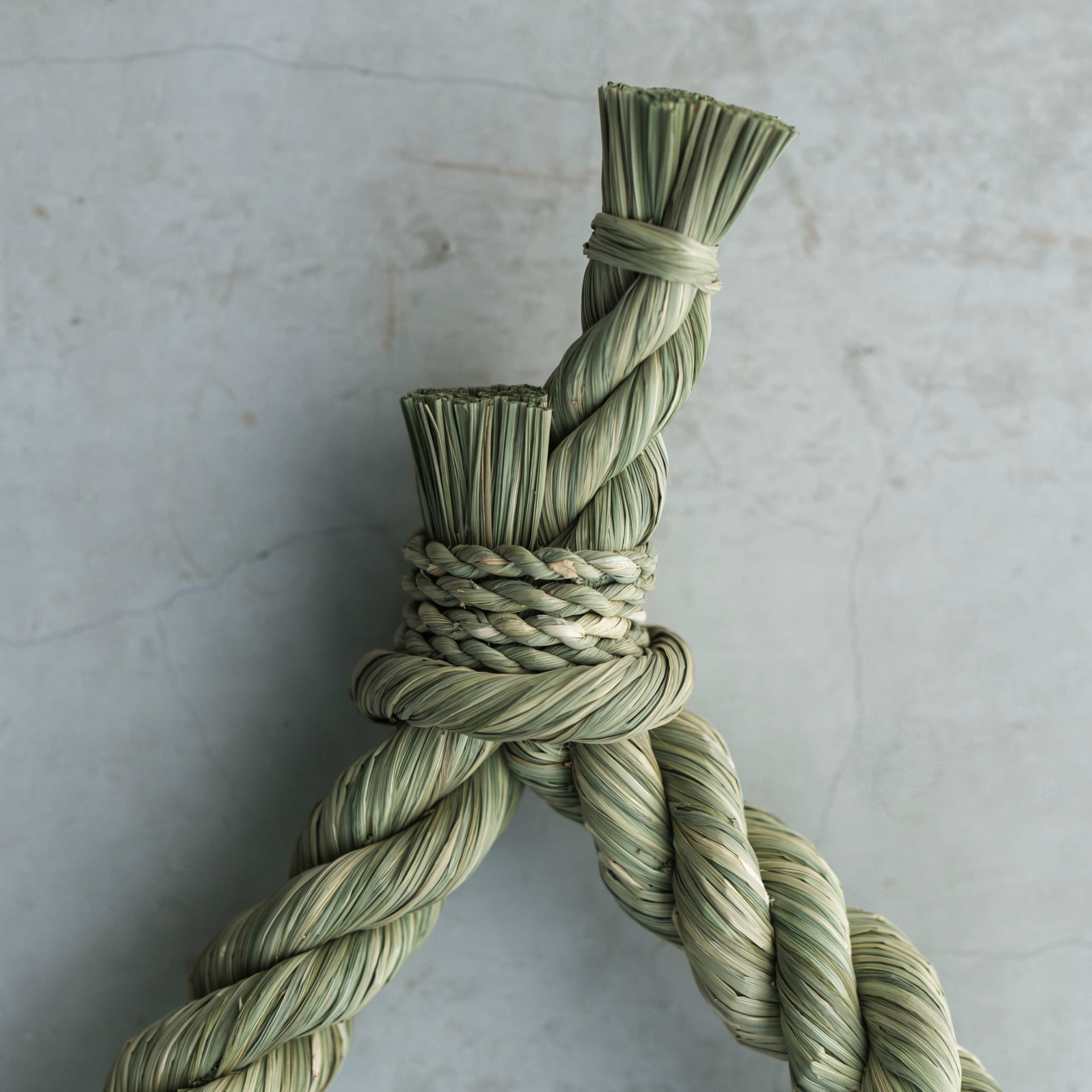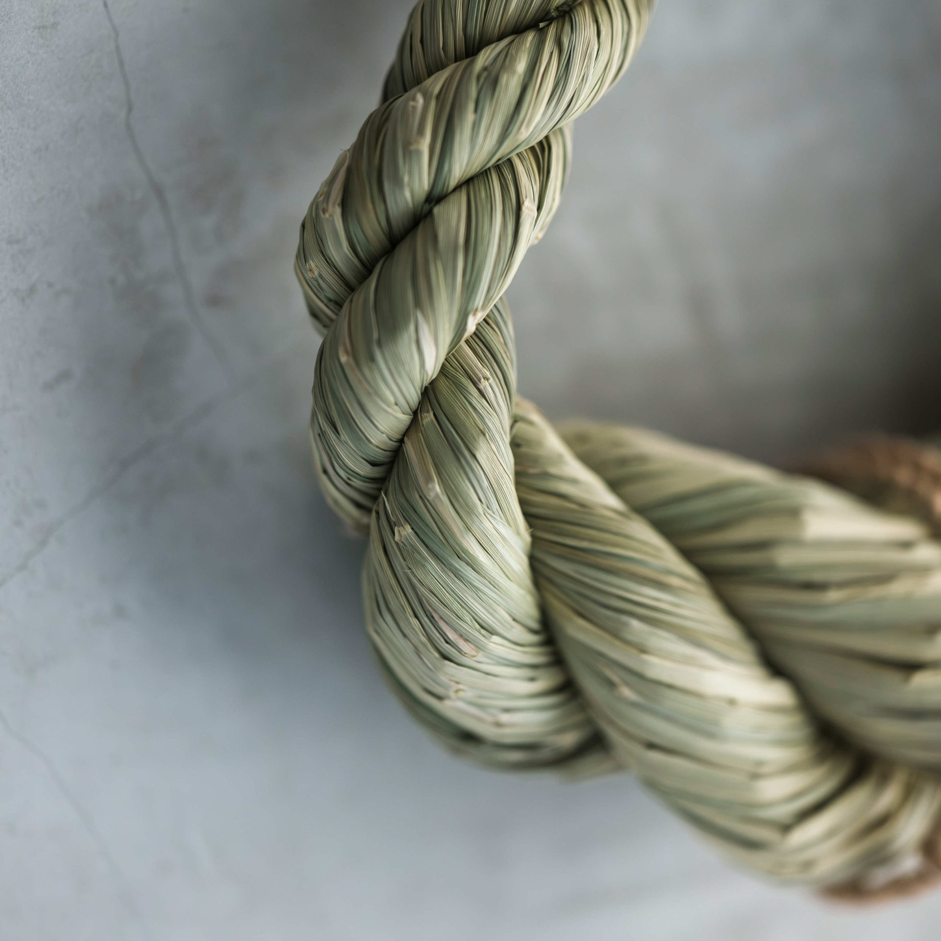 来る年の豊作を願い、お米がたくさん詰まった俵をイメージし作ったお飾りです。中央に垂らしたのは、大麻で作った縄と房。大麻は古より信仰の場においては清めという重要な役割を担ってきた素材です。米が実る前の今年の夏に刈り取った青わら(実とらず)で作っており、いい香りがします。