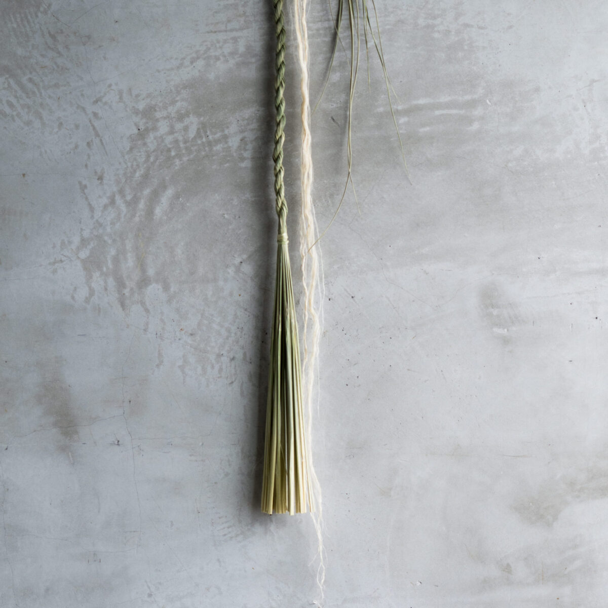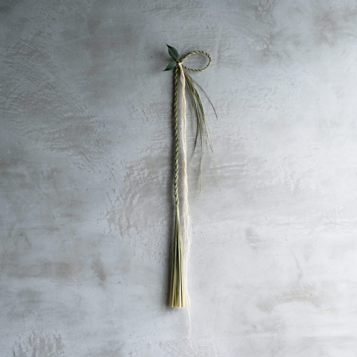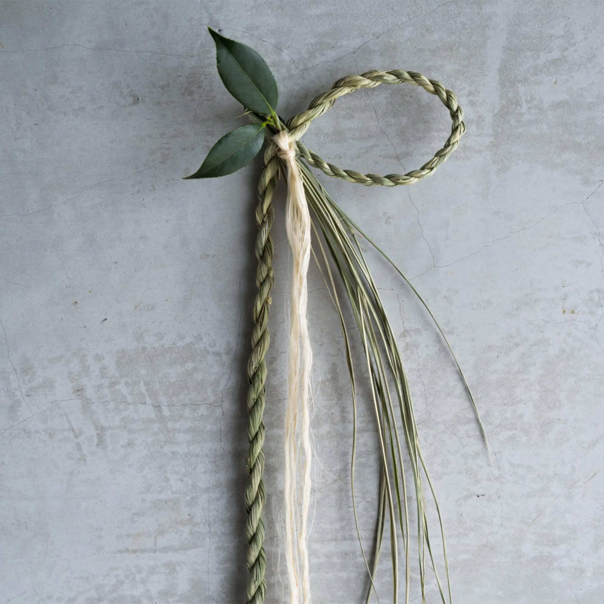 わら縄に添えたのは椿の葉と「打麻(うちそ)」(糸用に加工にした大麻)。打麻は優しく柔らかな輝きを放ちます。米が実る前の今年の夏に刈り取った青わら(実とらず)で作っており、いい香りがします。