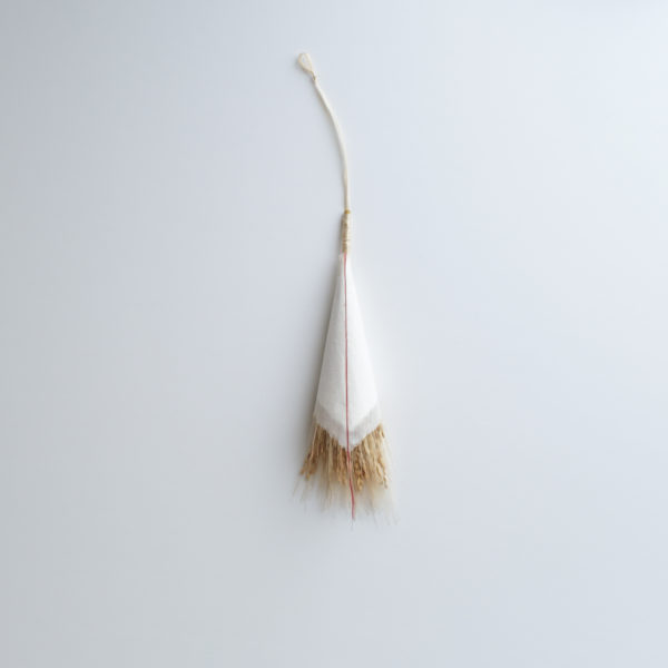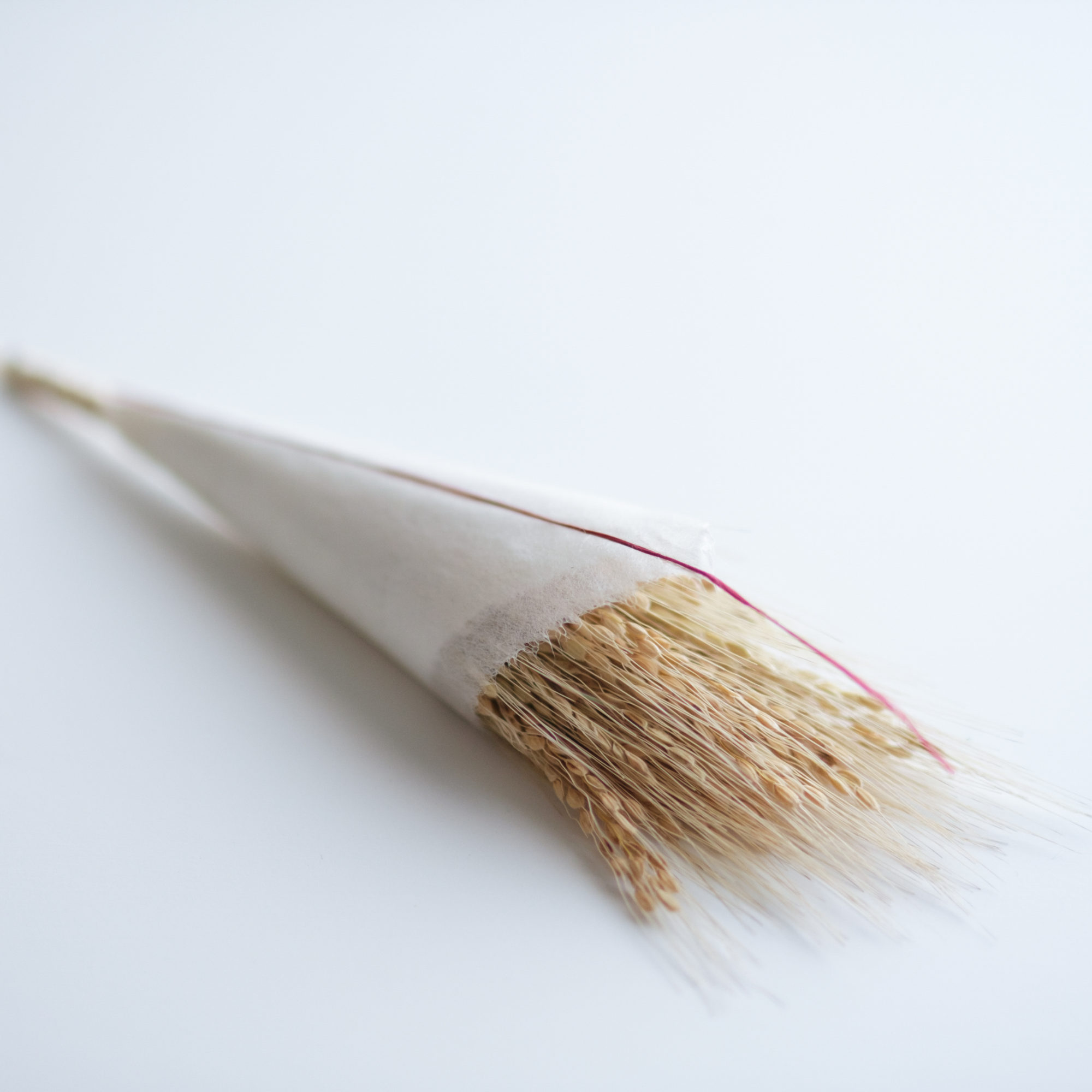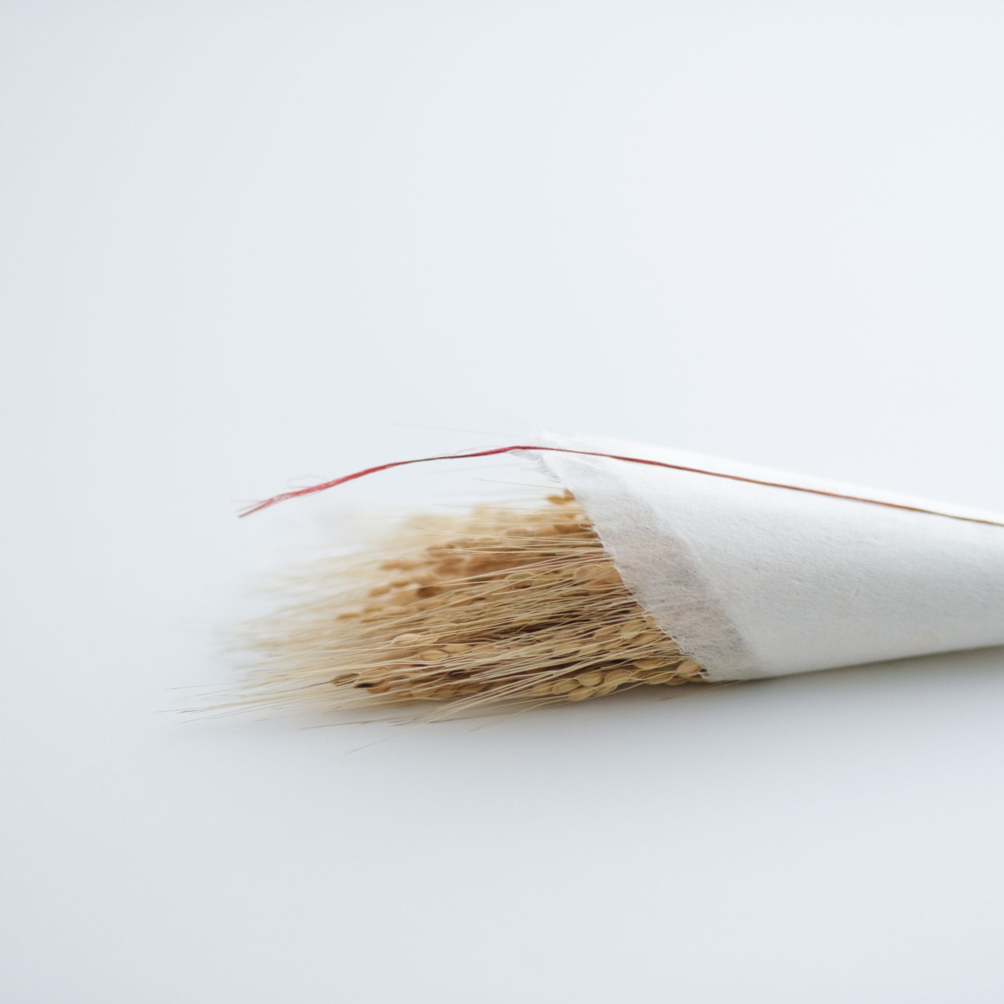白い毛の古代米は清く美しく優しい輝きを放っています。嫁に行く大切な娘のように包みました。こうぞからできた2種類の手漉き和紙で巻き、天然の素材(ヤマモモとカイガラムシ)で染め上げた大麻をそえています。