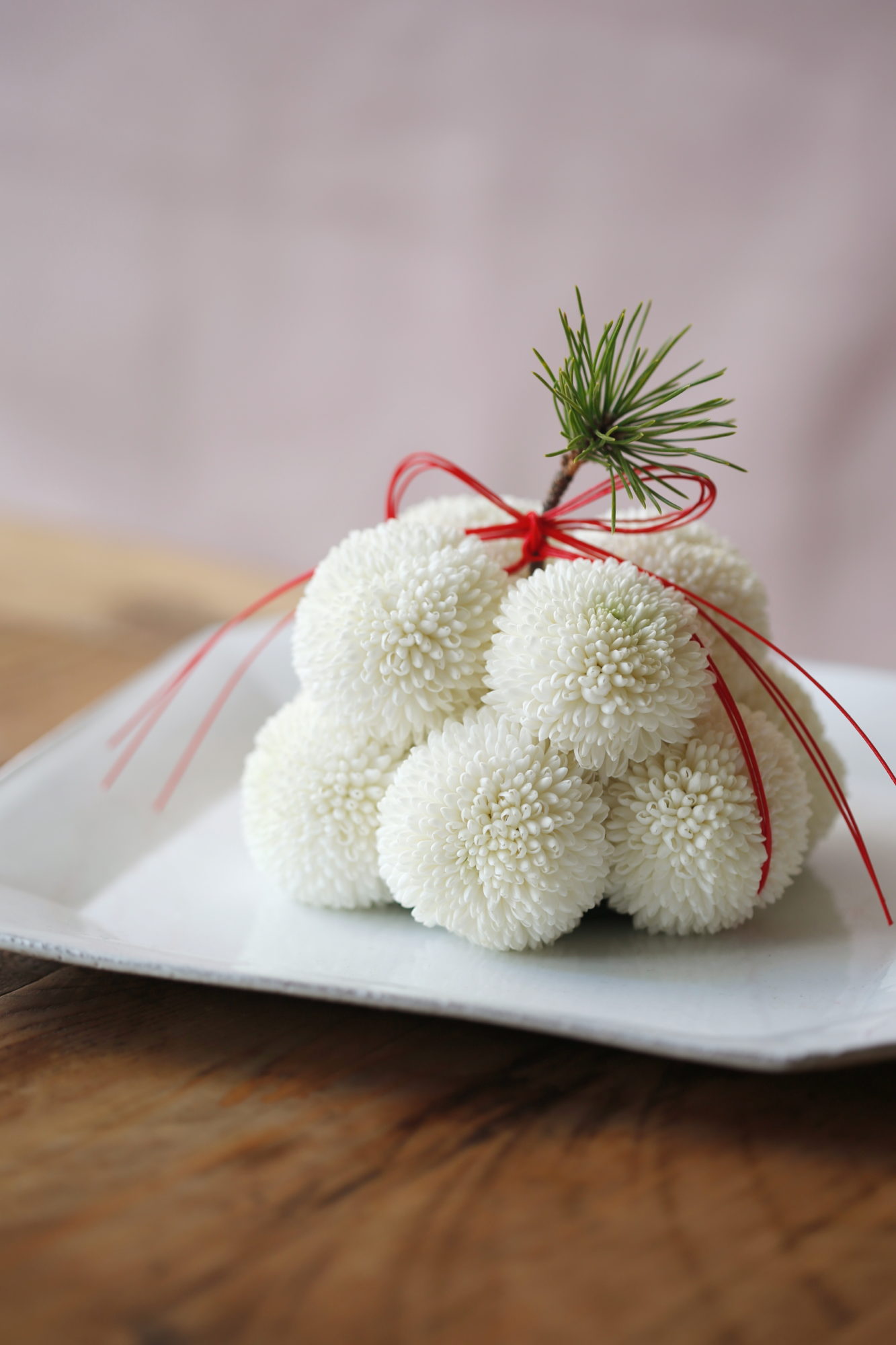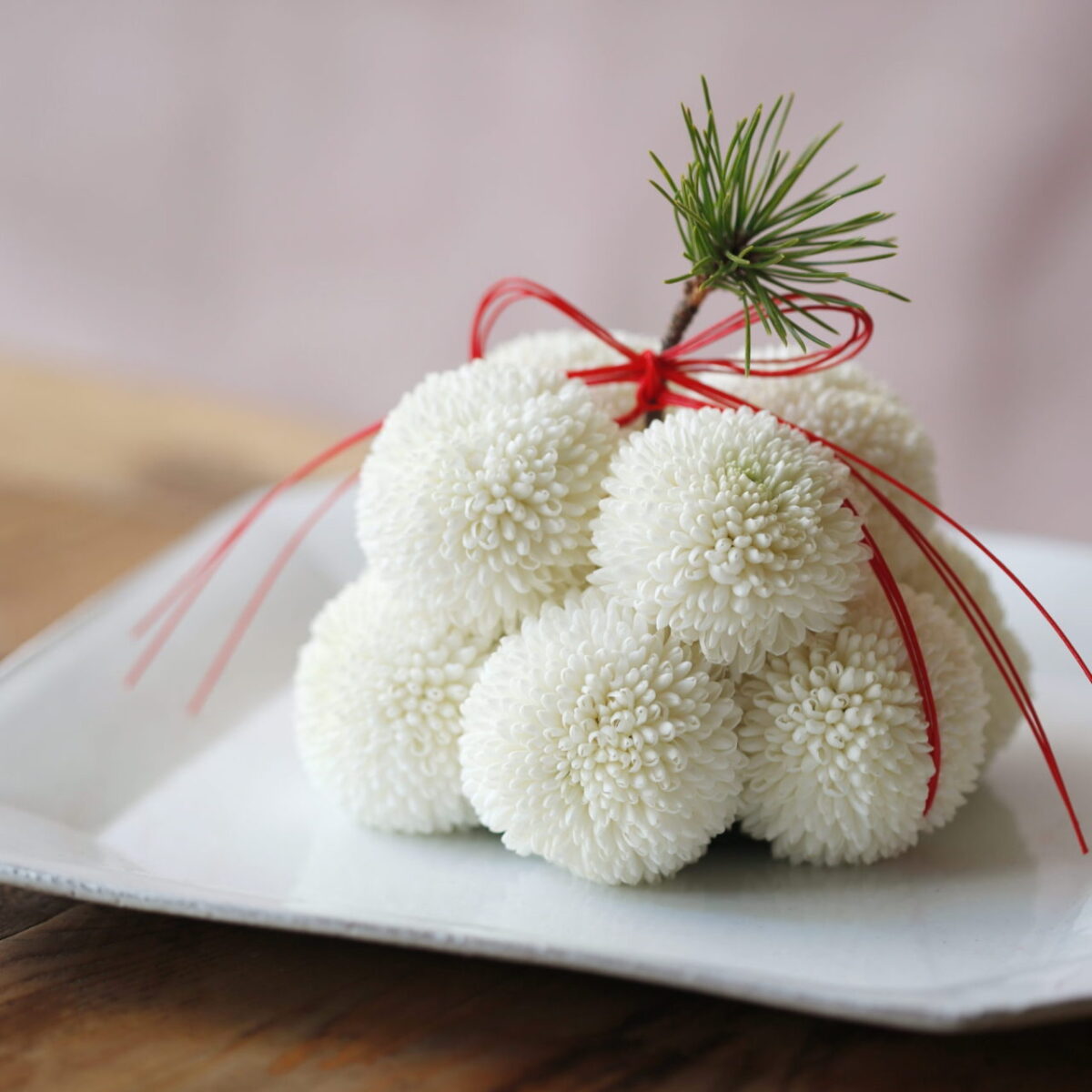 菊の花を鏡餅のように見立てました。1週間ほどは綺麗な状態でおたのしみいただけます。お好みの平皿と組み合わせたしつらえをお勧めしております。