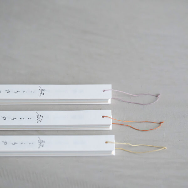 綴じ糸には、15色の草木染めの糸が使われています。また帯の和紙もいろんな色で束ねられています。ランダムにご用意しておりますので色をお選びいただくことは出来かねます。一期一会をおたのしみください。
