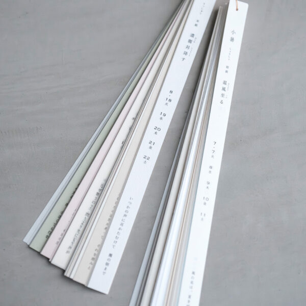 詩人・白井明大さんの短冊型の詩的カレンダーです。2026年の二十四節気七十二候とともに、白井明大さんのことばが添えられています。カレンダーは立春はじまりになっていています。二十四節気七十二候は、その時期の花や動物、虫などの自然の事物事象が名前になっています。流れゆく日々の中でより細やかな自然の移ろいをカレンダーを通して感じていただけると思います。